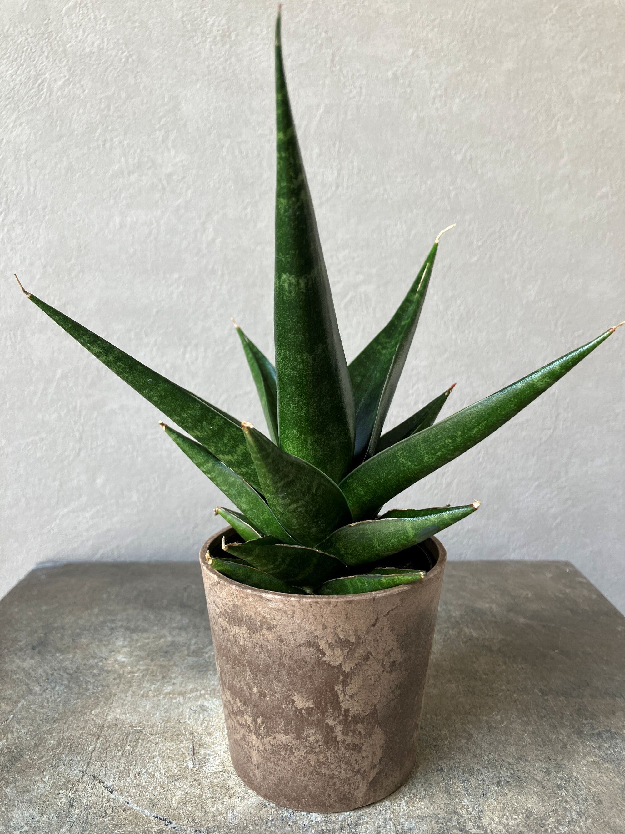 硬質で幅広の葉が、中心から螺旋を描くように広がるロゼット状のフォルムが特徴の「サンスベリア インド2」
